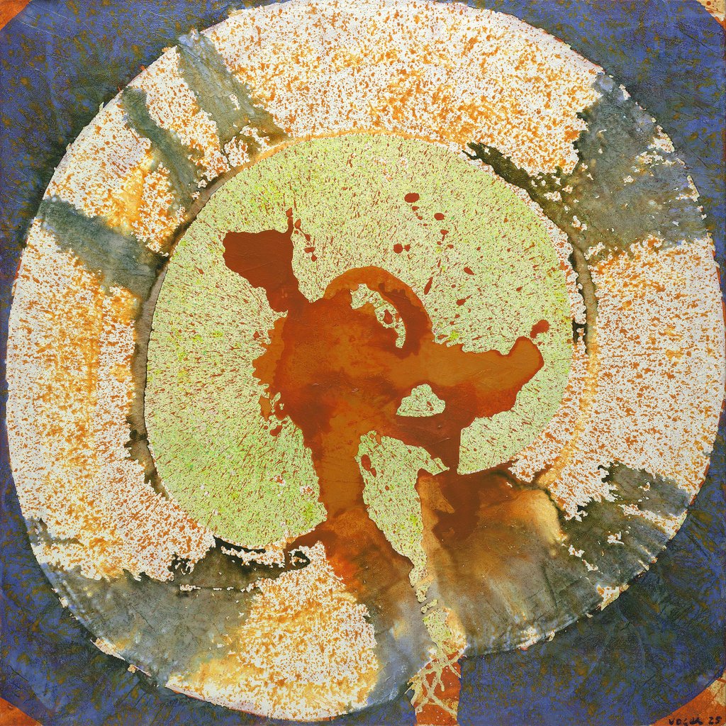 In dit doek is weer het spel gevolgd. Met in mijn hoofd het idee van de kosmos. De scheppingskracht verbeeldt. Te zien is dat de spetters echt vanuit het centrum naar buiten spatten.