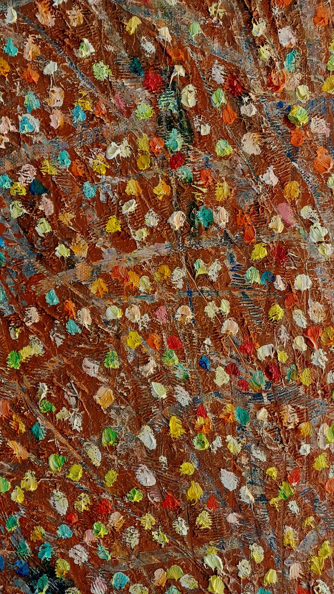 Het is weer eens een boomachtige vorm geworden. De verftoetsen spelen een lichtspel, als bladeren. Bomen zijn zo metaforisch als het maar kan.