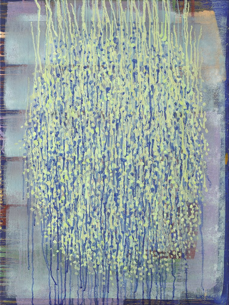 Viridiaangroen is een groen pigment. In veel culturen is dat besef aanwezig, dat besef dat een levenskracht door heel de schepping stroomt en vormgeeft aan de beweging van het leven. Ik herken dat wel. In dit doek laat ik ook weer de zwaartekracht het werk doen. Daar word ik blij van: Goede morgen!