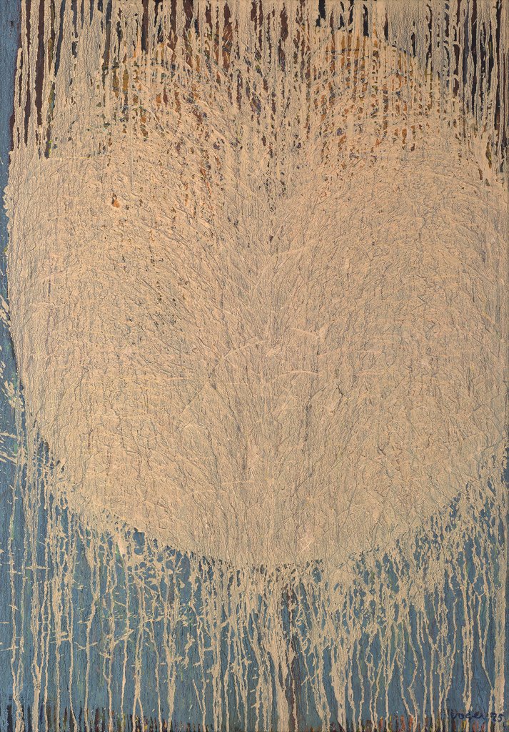 Dit doek is ontstaan door langdurig lagen over elkaar heen te schilderen, te zoeken en nog eens te zoeken. Ik wilde iets maar dat iets wilde niet.